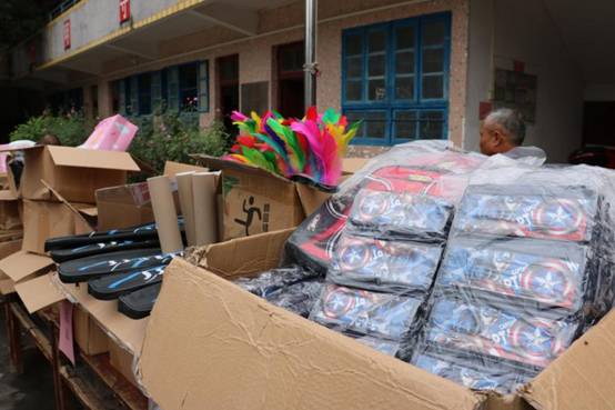 公司员工捐赠的书包体育用品等物资