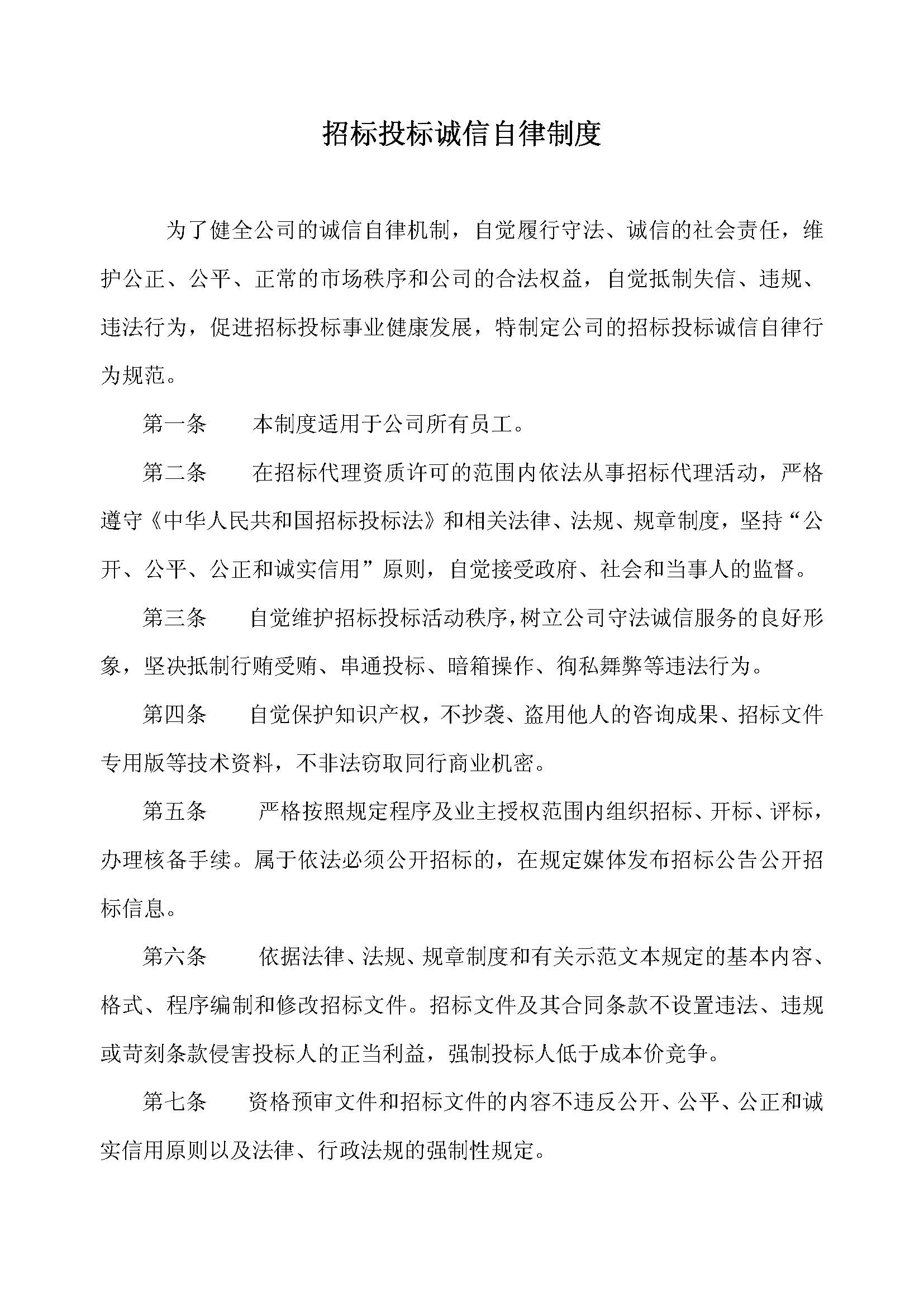 为了健全公司的诚信自律机制,自觉履行守法、诚信的社会责任,维护公正、公平、正常的市场秩序和公司的合法权益,自觉抵制失信、违规、违法行为,促进招标投标事业健康发展,特制定公司的招标投标诚信自律行为规范。